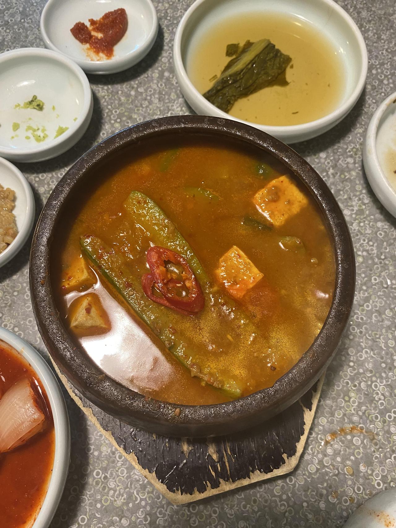 2인분 이상 주문 시 더욱 푸짐하게 즐길 수 있다. - 된장찌개: 예전에는 애호박이 통으로 들어가 독특한 비주얼과 식감을 자랑했지만,