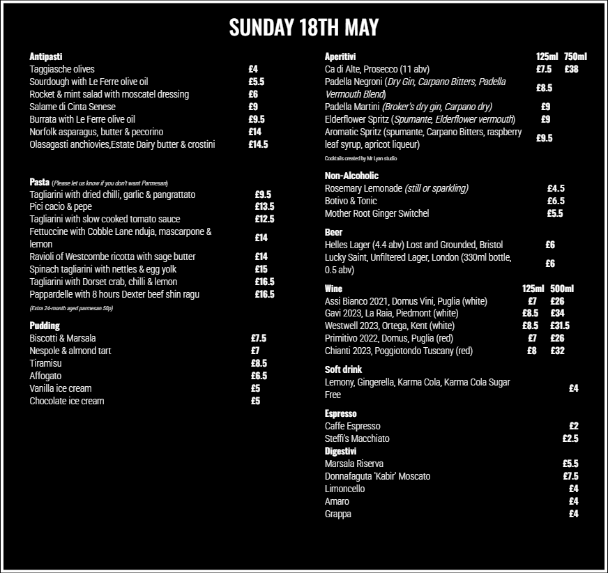 | Pici Cacio e Pepe | £13.5 | 21,600원 | 두툼한 피치 면에 치즈와 후추의 깊은 풍미 |