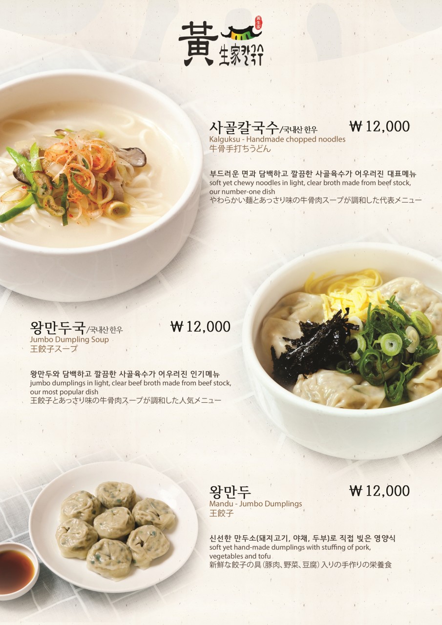 | 왕만두국 | 12,000원 | 사골육수에 큼직한 만두 5개, 계란지단과 김 토핑 |