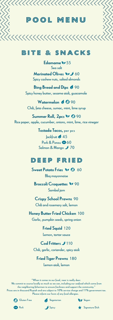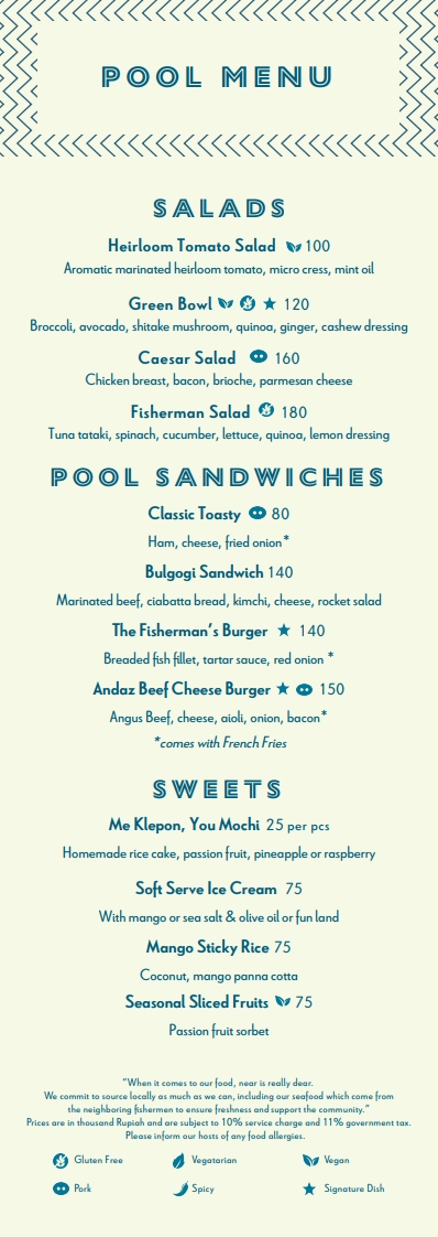 발리 안다즈(Andaz Bali)에 머무는 동안, 수영장에서의 여유로운 순간을 더욱 특별하게 만들어주는 풀사이드 전용 메뉴(Poolside Menu)를 소개할게요.